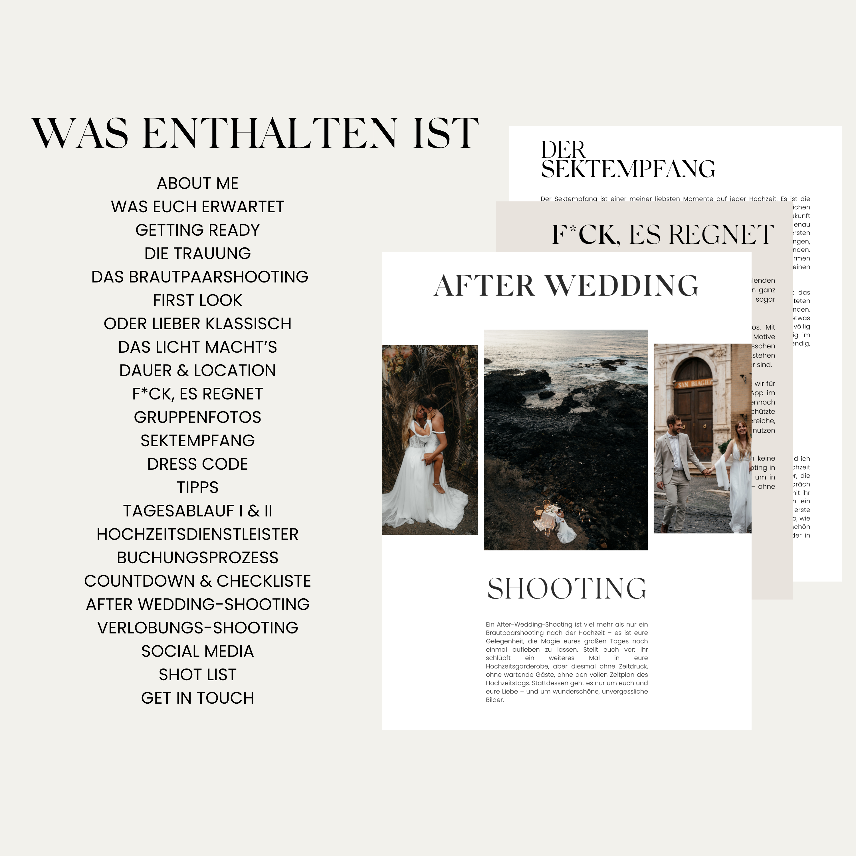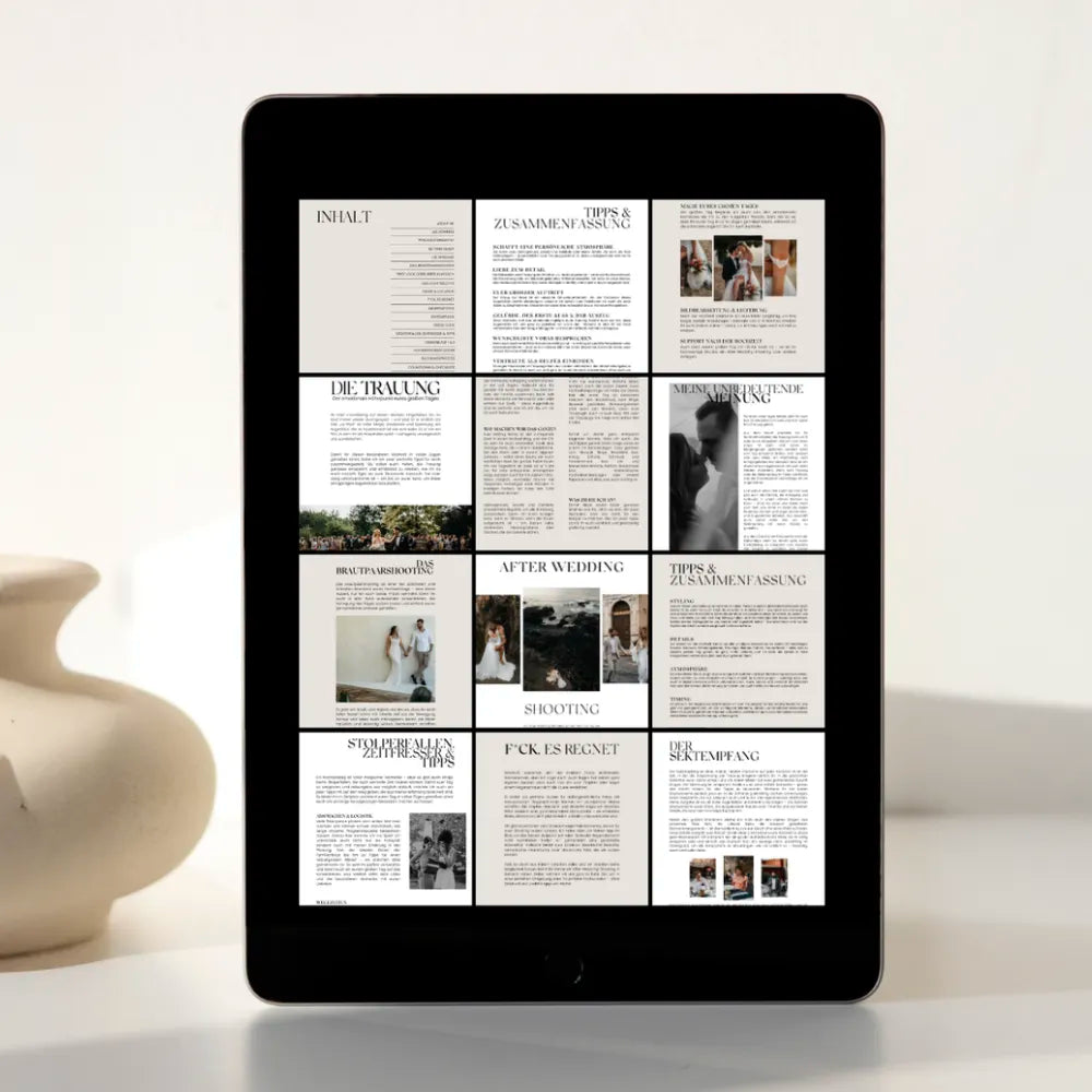 Der Guide deckt alle wichtigen Themen ab – von Getting Ready über das Brautpaarshooting bis zur Party. Zusätzlich gibt es Tipps, Ablaufpläne, Checklisten und Inspirationen für deine Paare.