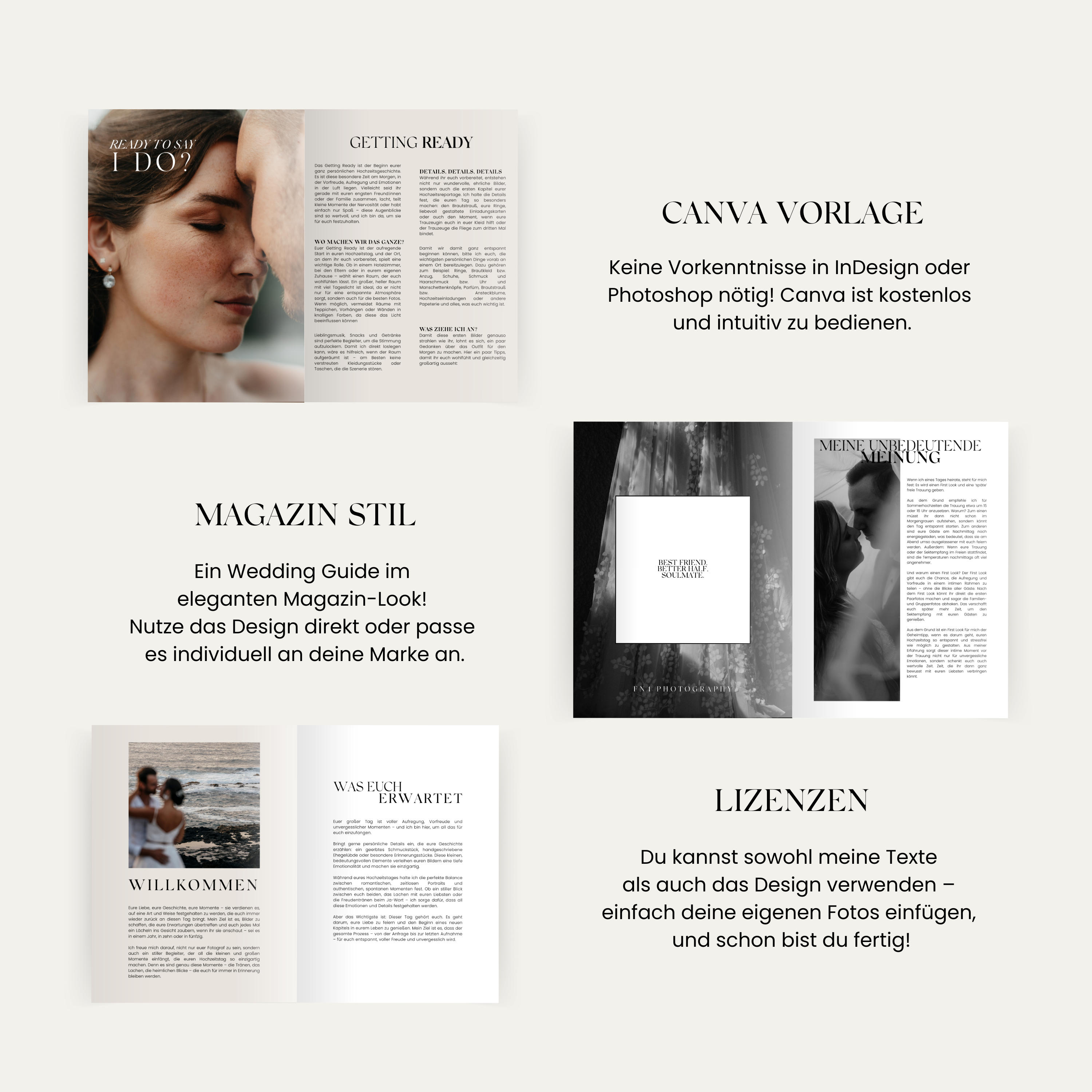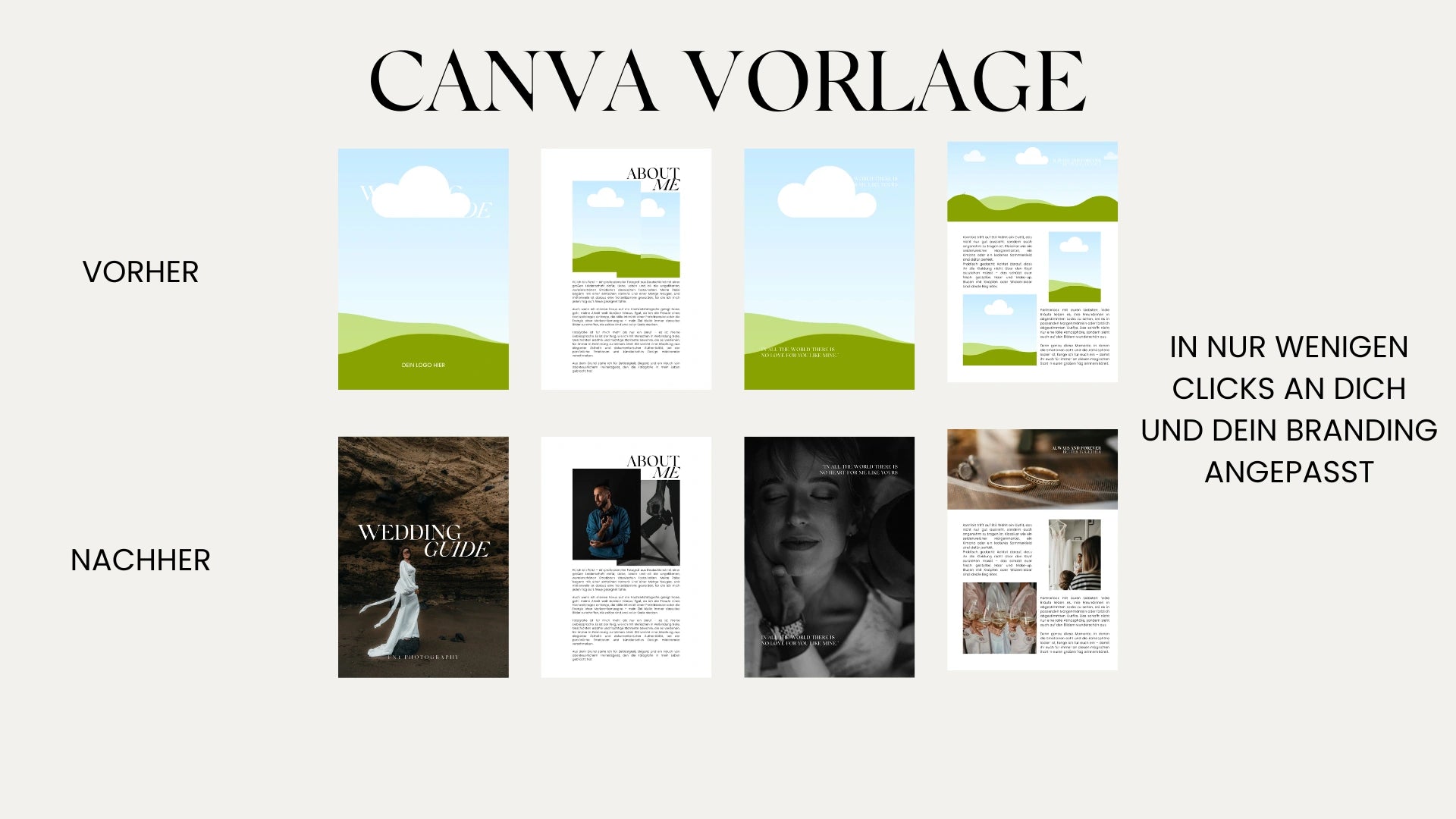 Der Wedding Guide ist ein umfassendes Tool, das deinen Brautpaaren Sicherheit gibt und deine Kundenkommunikation professionalisiert. Die 57-seitige, voll editierbare Canva-Vorlage führt deine Paare durch alle wichtigen Aspekte der Hochzeitsplanung – vom Getting Ready bis zur Party. Durch die Kombination aus professionellem Design und praxisnahen Inhalten werden Unsicherheiten abgebaut und das Vertrauen in deine Arbeit gestärkt. Damit schaffst du die besten Voraussetzungen für entspannte Paare und emotionale Bilder.