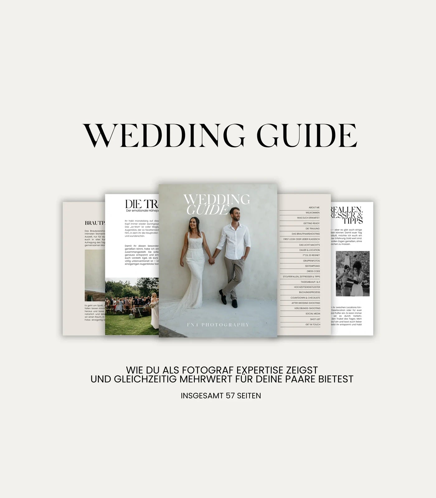 Mit dem Wedding Guide erhalten deine Brautpaare eine klare Struktur für ihren großen Tag. Weniger Unsicherheiten, mehr Vertrauen – für entspannte Kunden und natürliche, emotionale Fotos.