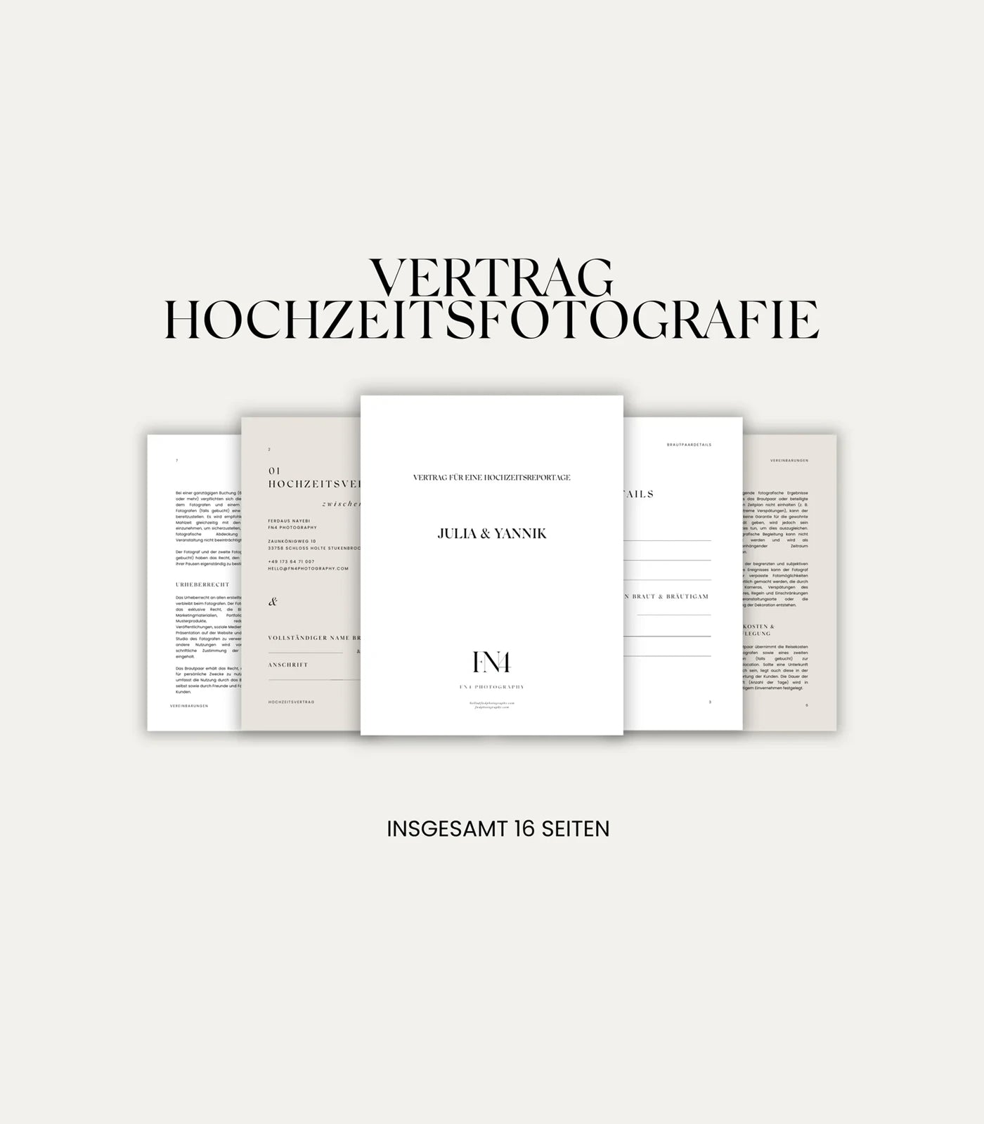 Mit dem Hochzeitsvertrag bist du optimal aufgestellt: Diese editierbare Vorlage sichert deine Shootings rechtlich ab und sorgt für klare Vereinbarungen mit deinen Brautpaaren. DSGVO-konform und mit allen wichtigen Klauseln ausgestattet, schützt dich der Vertrag vor unangenehmen Überraschungen und unterstreicht deinen professionellen Anspruch. Der Vertrag spart dir wertvolle Zeit und minimiert rechtliche Risiken – individuell anpassbar über Canva.