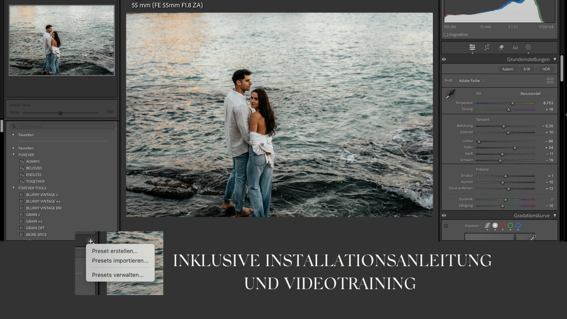 Das "Forever" Preset Pack wurde speziell für die Hochzeitsfotografie entwickelt und bringt deine Bildbearbeitung auf das nächste Level. Vier hochwertige Lightroom-Presets für Classic & Mobile sorgen für authentische Hauttöne, natürliche Farben und einen konsistenten, zeitlosen Stil. Jedes Preset wurde aus über zehn Jahren Erfahrung heraus entwickelt und garantiert schnelle und intuitive Bearbeitungsergebnisse. Mit der detaillierten Videoanleitung und dem Import-Guide gelingt dir der Start ohne Umwege – egal ob als Profi oder Anfänger. Perfekt für Hochzeiten, Porträts und kreative Projekte.